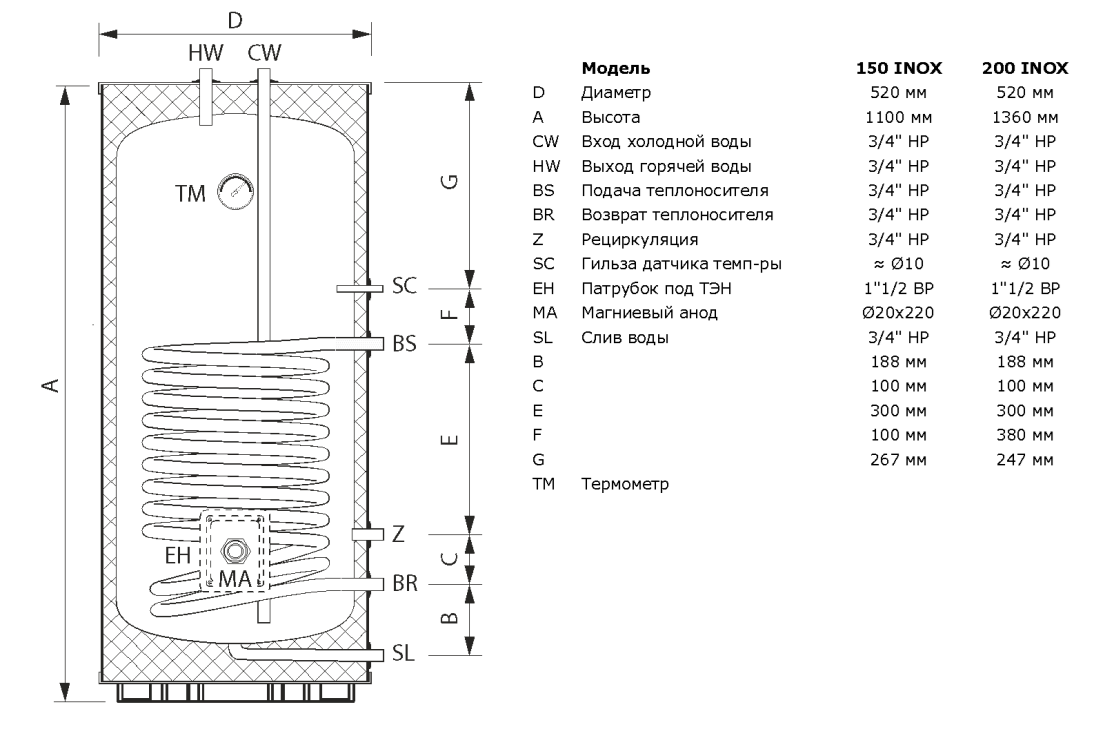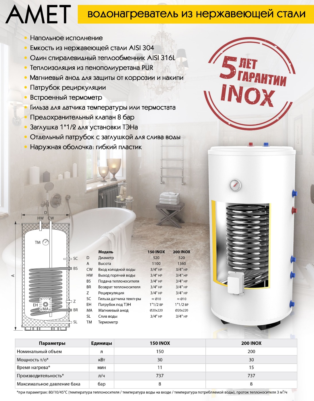 Устройство и габариты напольного бойлера косвенного нагрева AMET INOX 150 литров