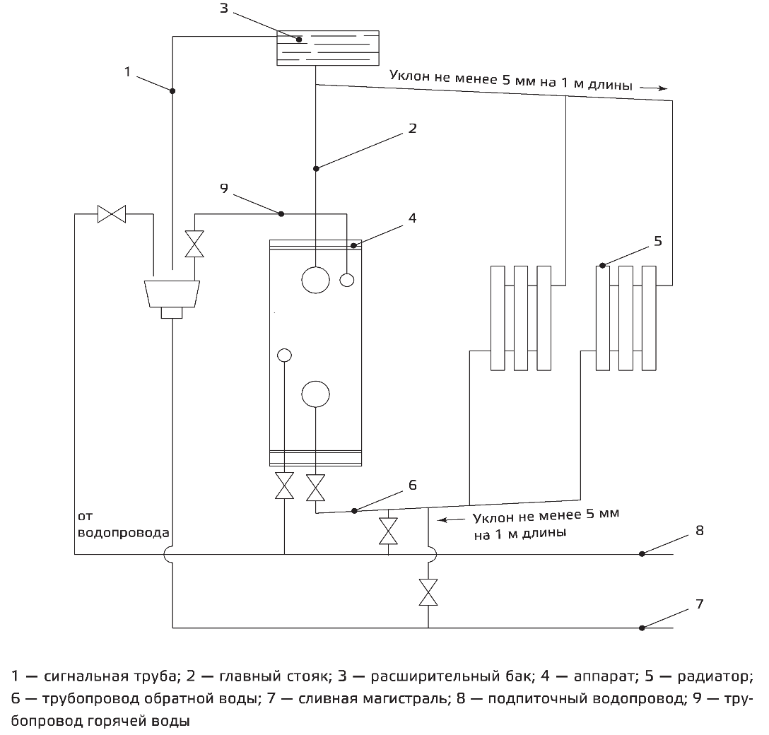 Примерная открытая схема системы отопления с использованием аппарата на горячее водоснабжение Сиберия 29к