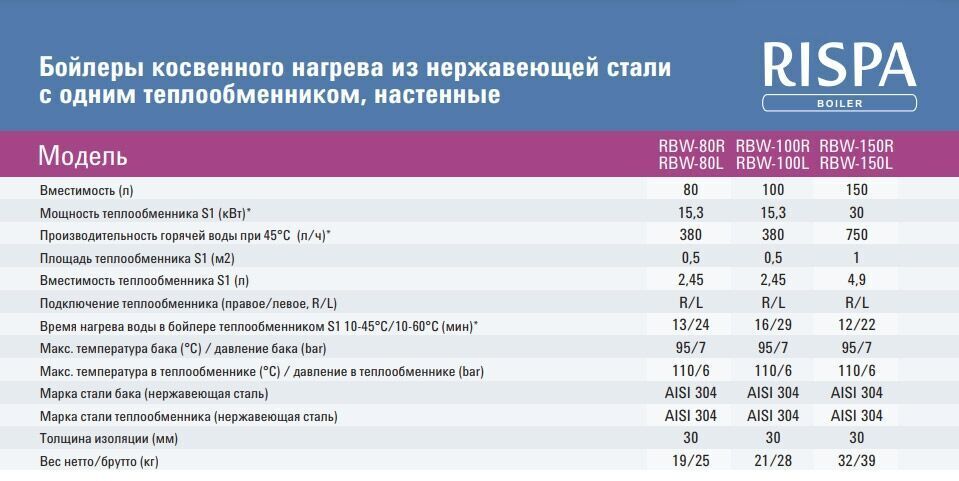 Бак бойлера RISPA RBW изготовлен из нержавеющей стали, марка стали бака и теплообменника — AISI 304, предназначенной для работы с агрессивной средой. Бойлер имеет возможность подключения принудительной рециркуляции ГВС. Снаружи бак имеет жесткий пластиковый корпус, разборную секционную теплоизоляцию.