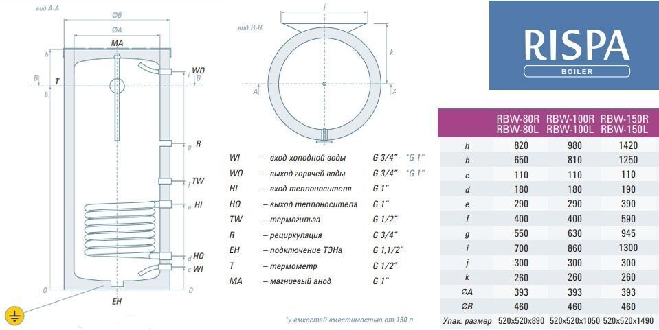 Бойлер косвенного нагрева RISPA RBW 150 литров представляет собой бак из нержавеющей стали нагреваемый теплоносителем, который движется в трубчатом теплообменнике и отдает свое тепло, полученное от котла отопления. RISPA RBW оснащается баком и трубчатым теплообменником изготовленными из нержавеющей стали с толщиной 1,5 мм. RISPA RBW 150L имеет объем 150 литров и применяется для нагрева и хранения воды, используемой для хозяйственных нужд в бытовых (жилых) и коммерческих помещениях, к которым подведено холодное водоснабжение с давлением не более 0,6 МПа (6 bar).